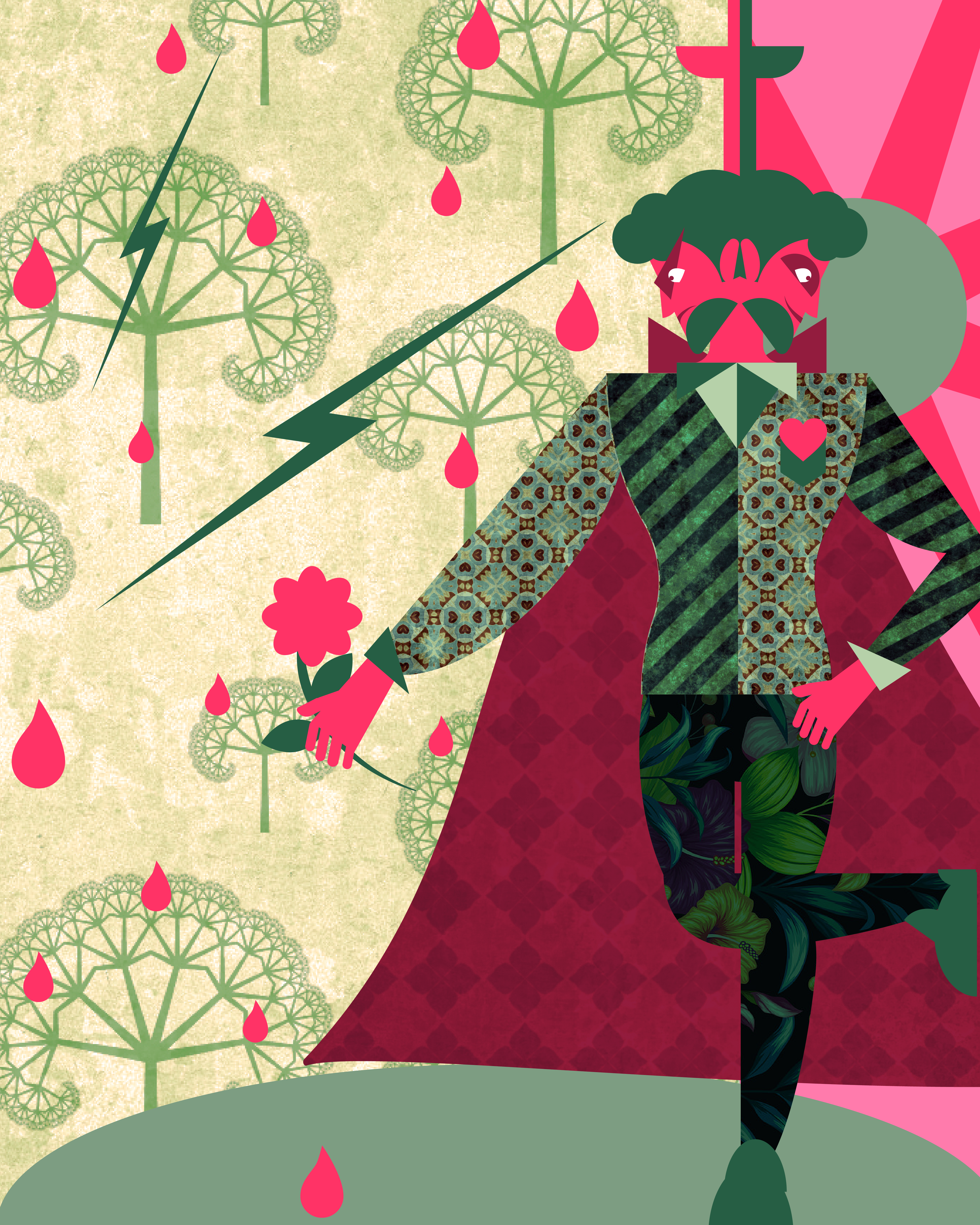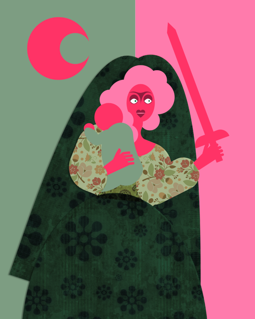 Una figura archetipica a metà tra maternità e guerriera. La palette oppone il verde alla saturazione del magenta, in un contrasto emotivo tra cura e vigilanza. I pattern floreali sono tessuti di memoria domestica – una pelle che veste la difesa.