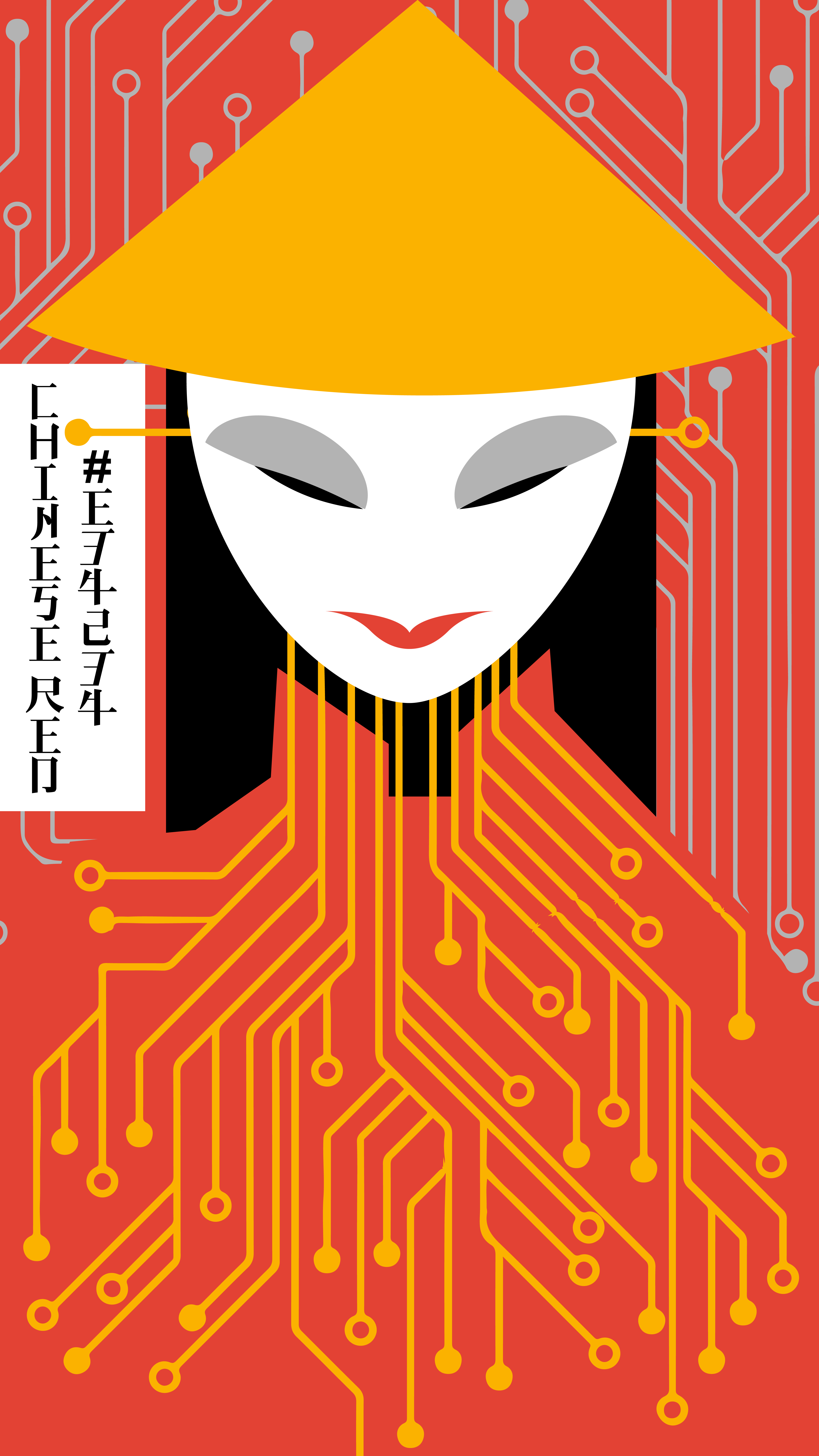IT: Il rosso cinese è il colore della vita, della prosperità e del tempo che si rinnova. Nella tavola, l’archetipo femminile si fonde con la geometria del circuito: una geisha-cyber, dove la tradizione diventa matrice digitale. È un omaggio all’energia che attraversa le culture, trasformandosi senza mai spegnersi.